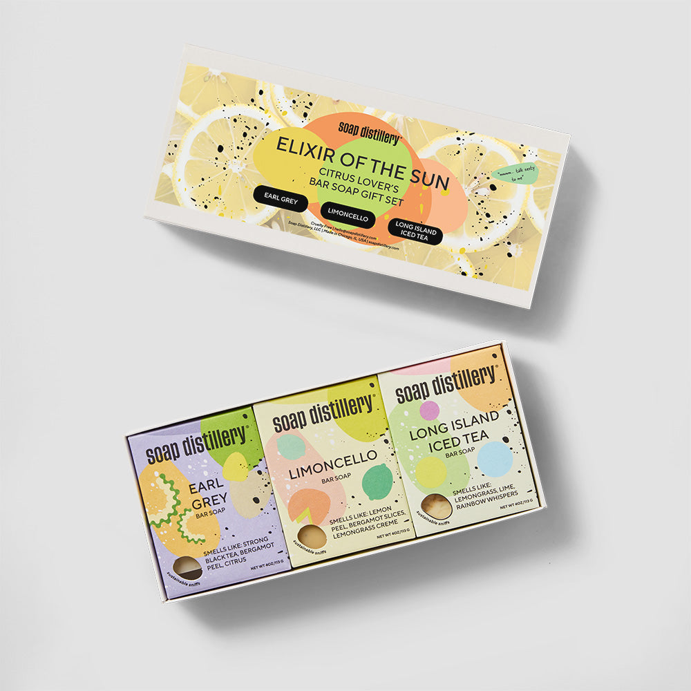 Harness the power of the sun with this upliftingly citrusy gift set! This set contains three citrus bar soaps. good enough to brighten any mood. Citrus oils have been clinically proven to improve depression. anxiety. and stress behaviors. Combine that with smelling good. and you’ve got a winning combination! This set contains one (1) full bar of each uplifting scented soap: Earl Grey. Limoncello. Long Island Iced Tea. Each bar soap is individually boxed.