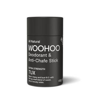 The 100% natural. 100% effective Woohoo Tux natural deodorant is all class. This extra-strength natural deodorant banishes body odour in style. keeping you fresh all day and into the night. The bergamot and patchouli scent is a top-shelf blend of sweet. spicy and woody notes. Now with a smoother glide and upgraded BO-busting power.